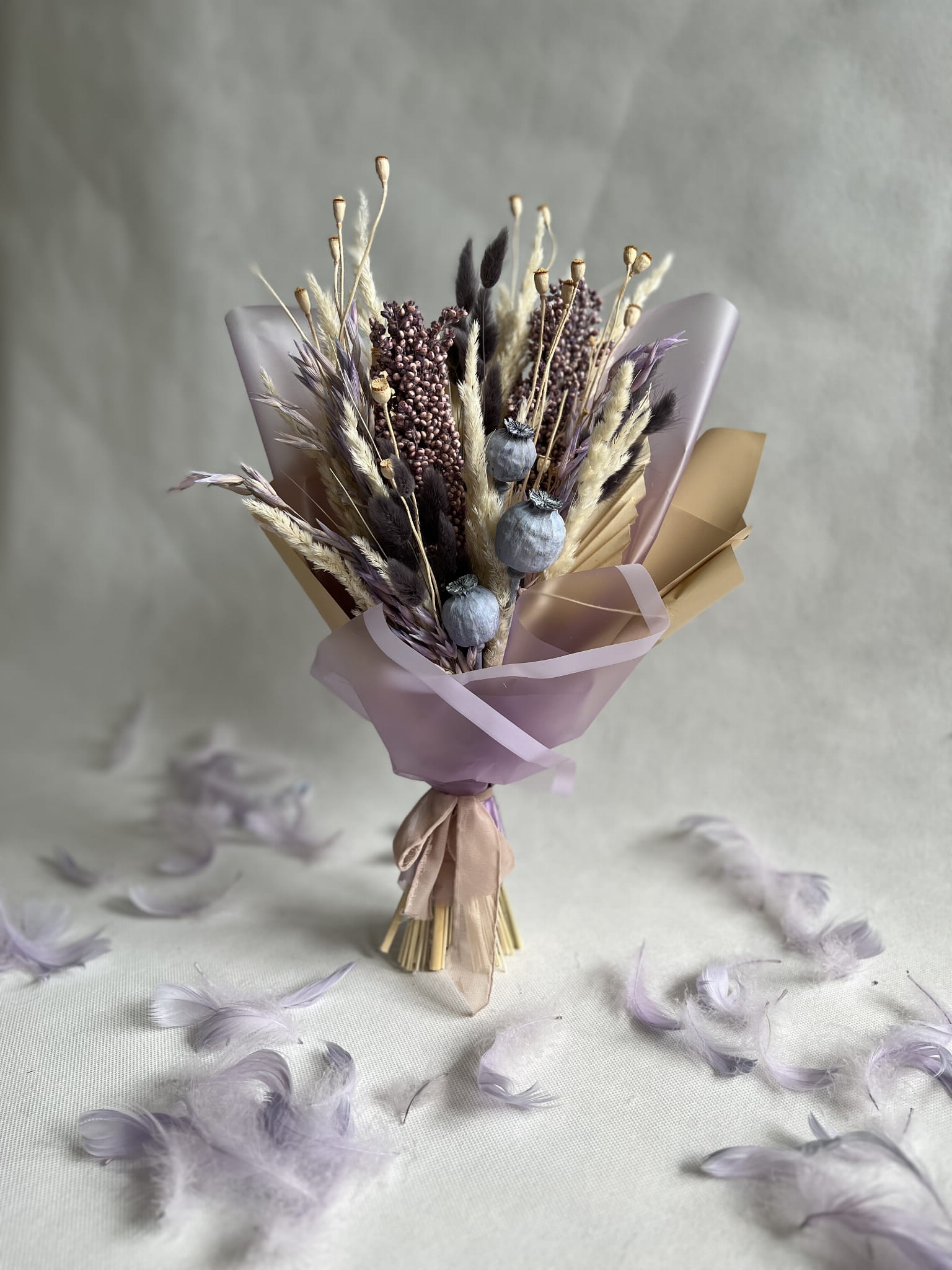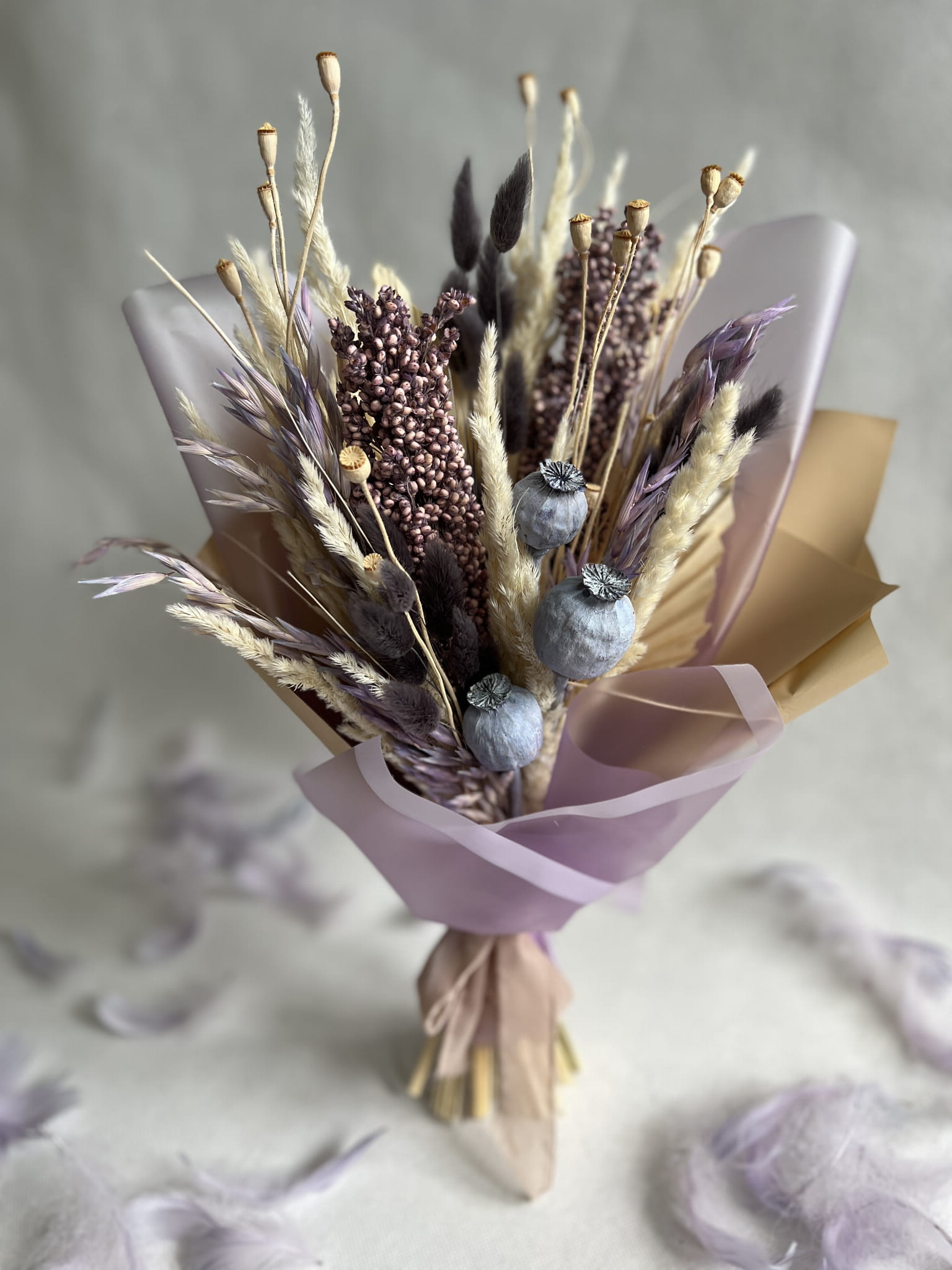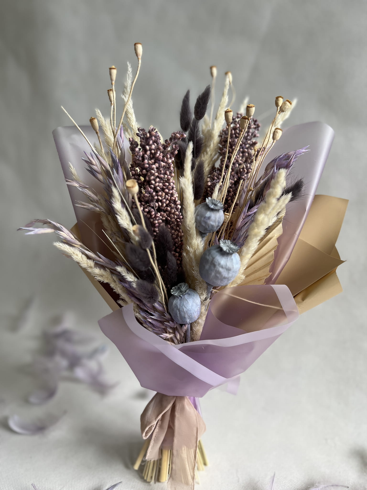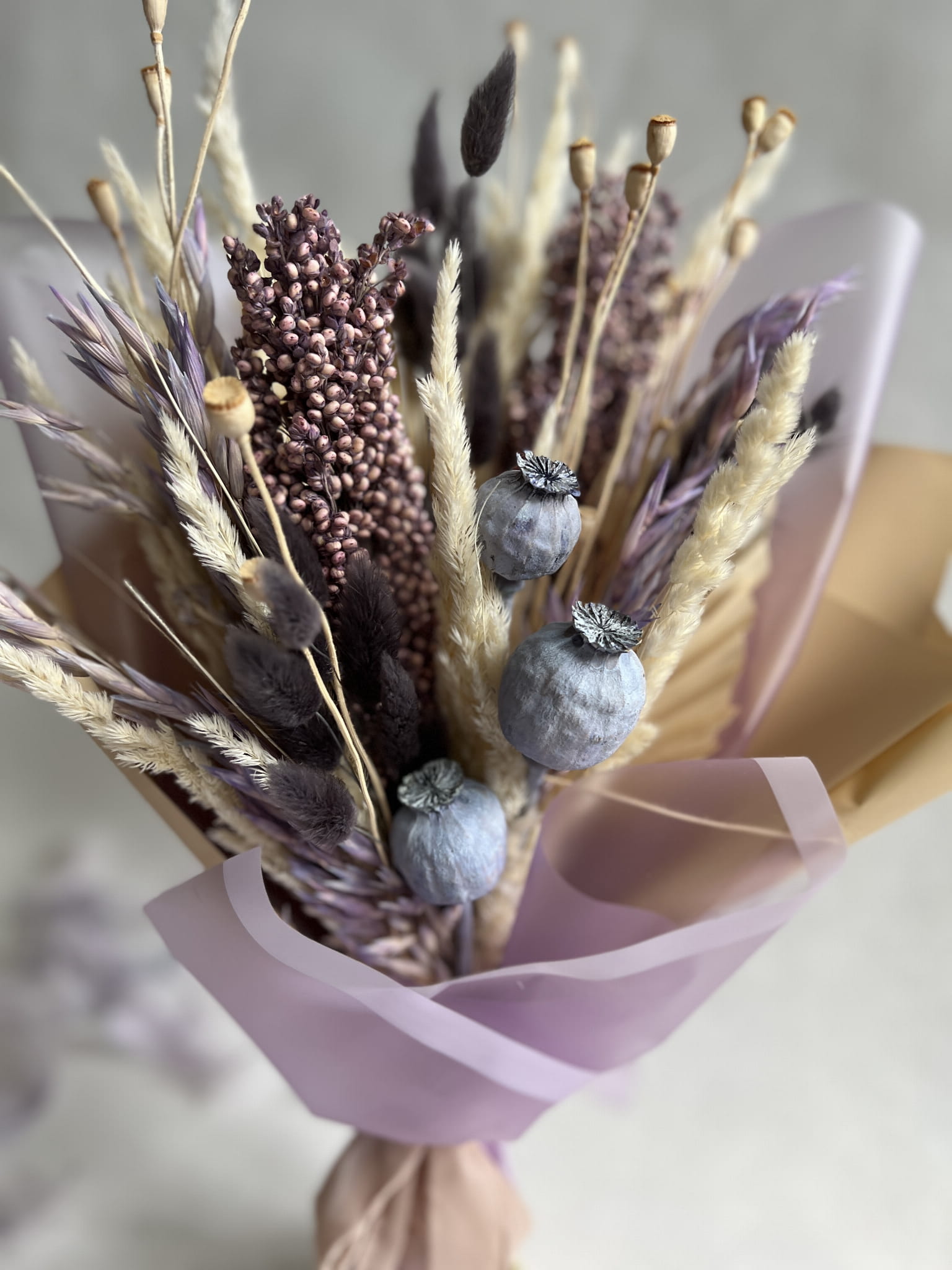 Dmuszek w ciemno szarym kolorze wprowadza subtelny akcent głębi i nadaję elegancji. Ciekawym akcentem bukietu jest suszony owies w lawendowym kolorze. Mini makówki stanowią uroczy dodatek, nadając bukietowi wyjątkowej finezji i piękna.